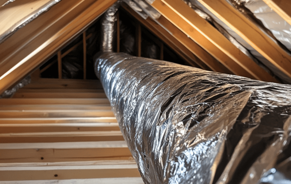 Ductwork wrapped in Energy Shield reflective insulation in an attic to prevent heat loss, condensation, and energy waste